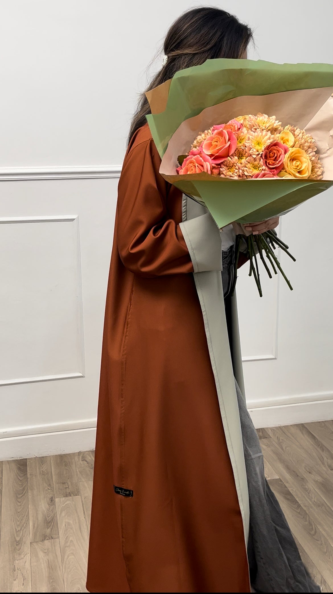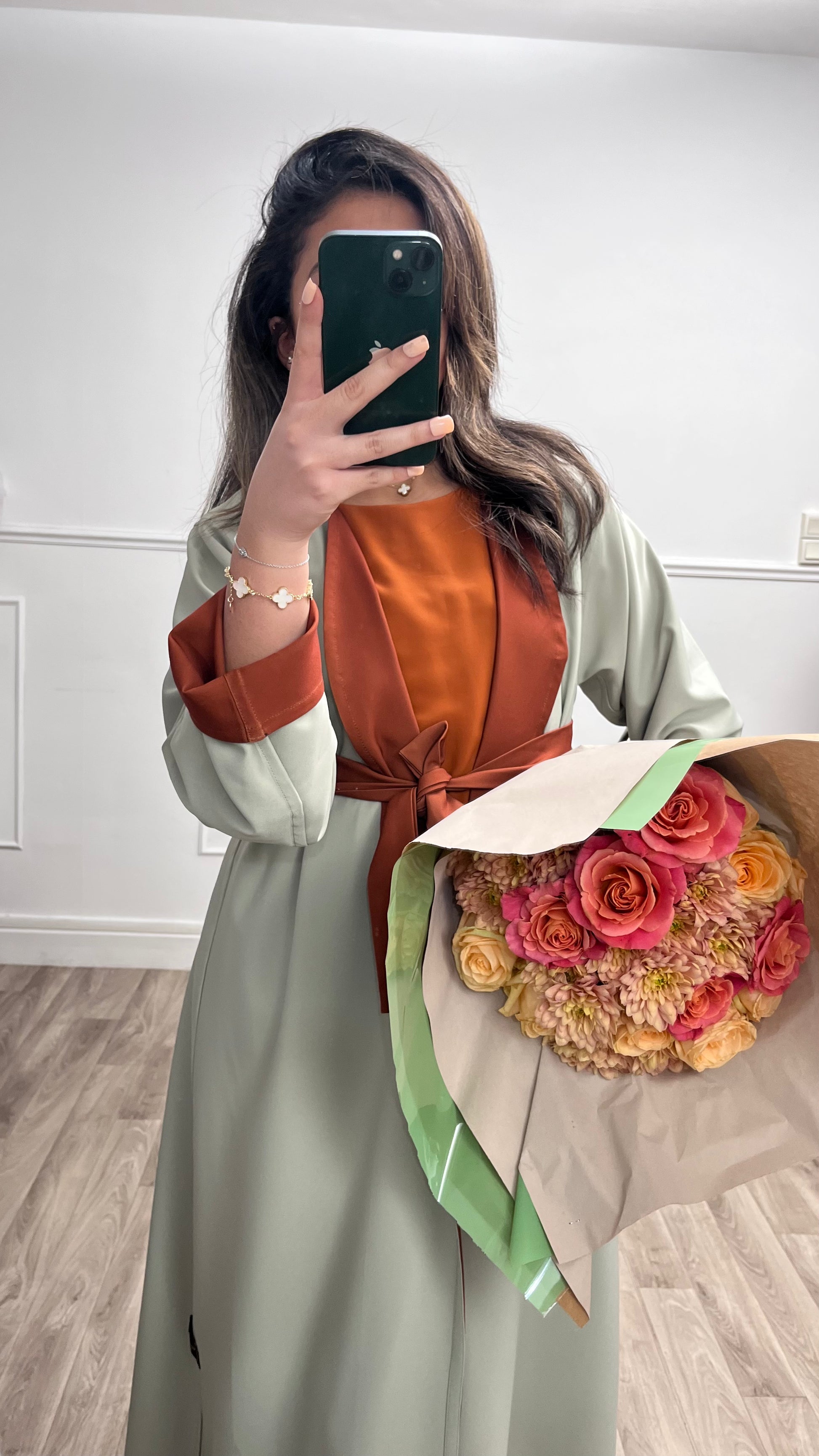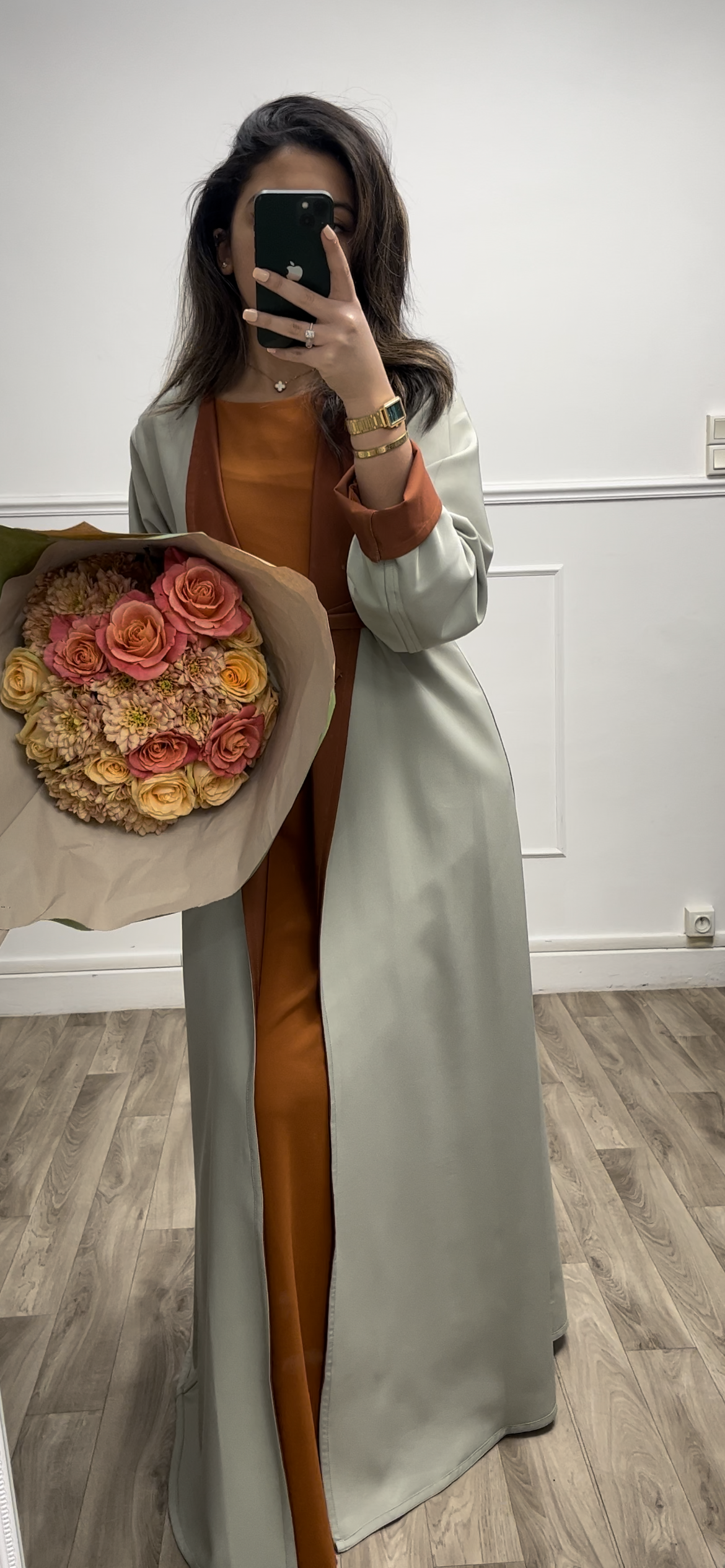 Inspirée des tendances des Émirats , la Abaya RAJAA est une abaya reversible ayant un côté de couleur brique et l’autre d’un vert gris.L’originalité de celle ci est l’association de ses couleurs .