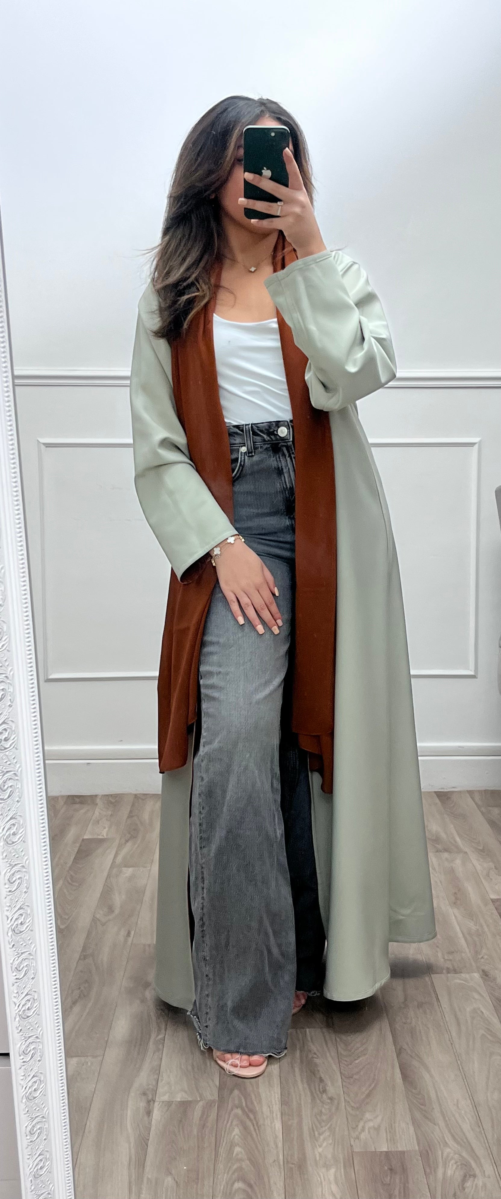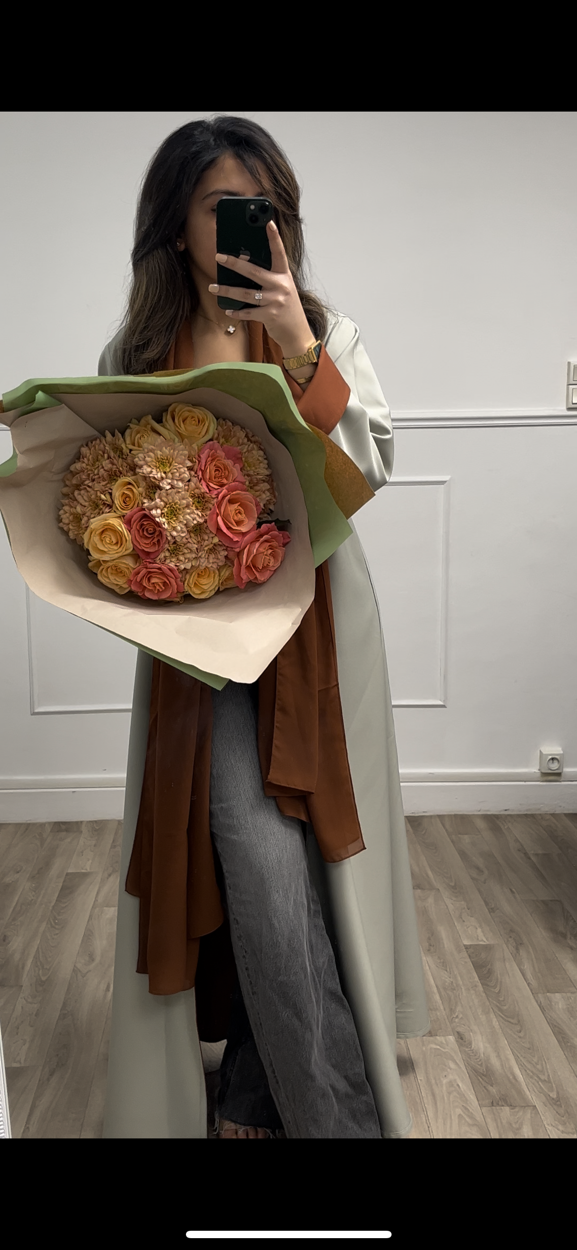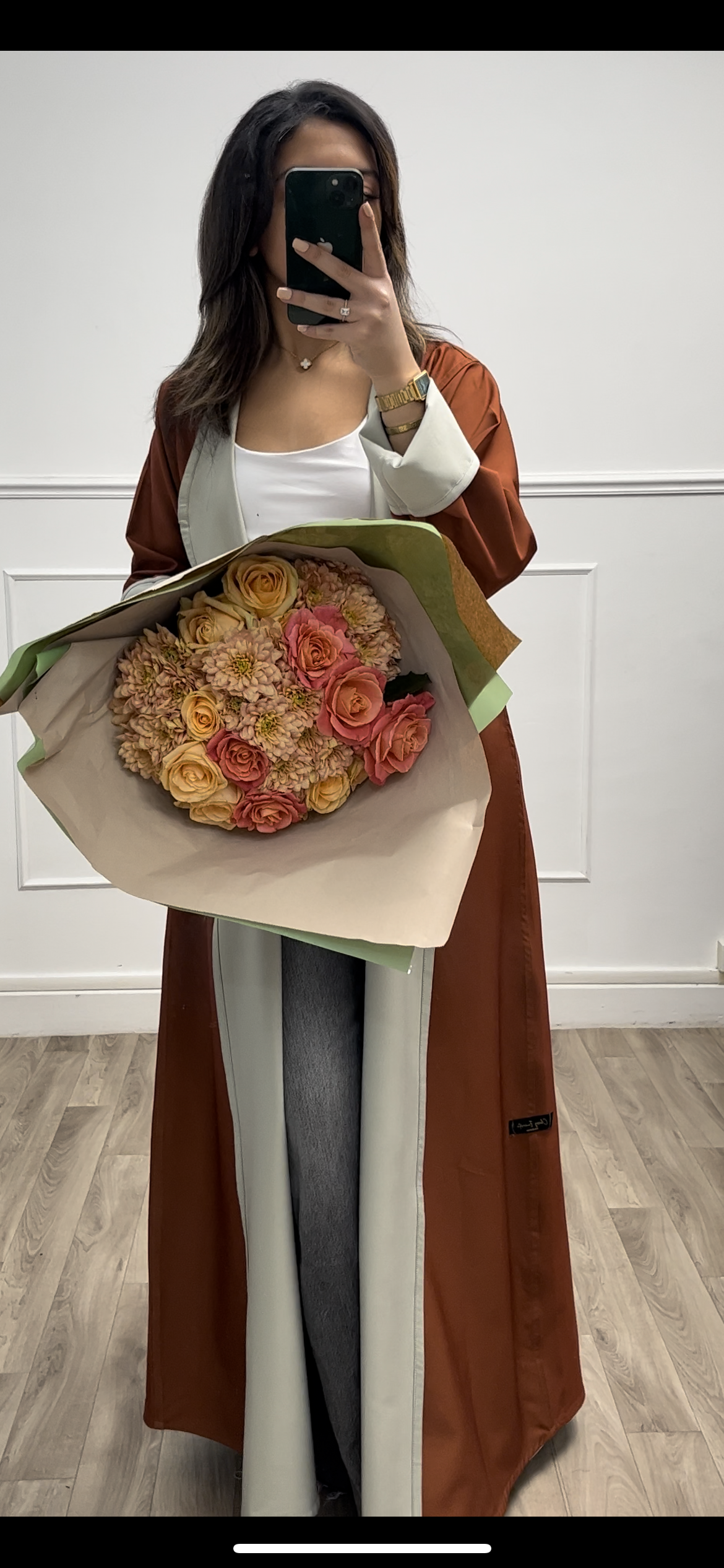 Inspirée des tendances des Émirats , la Abaya RAJAA est une abaya reversible ayant un côté de couleur brique et l’autre d’un vert gris.L’originalité de celle ci est l’association de ses couleurs .