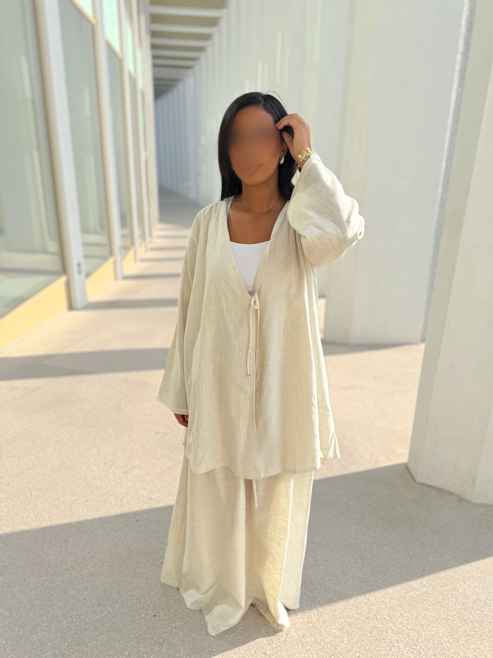L’ensemble HIMAÏA incarne l’essence du chic estival. Confectionné dans un lin beige naturel, à la fois léger, respirant et texturé, il offre un équilibre parfait entre confort et élégance structurée.