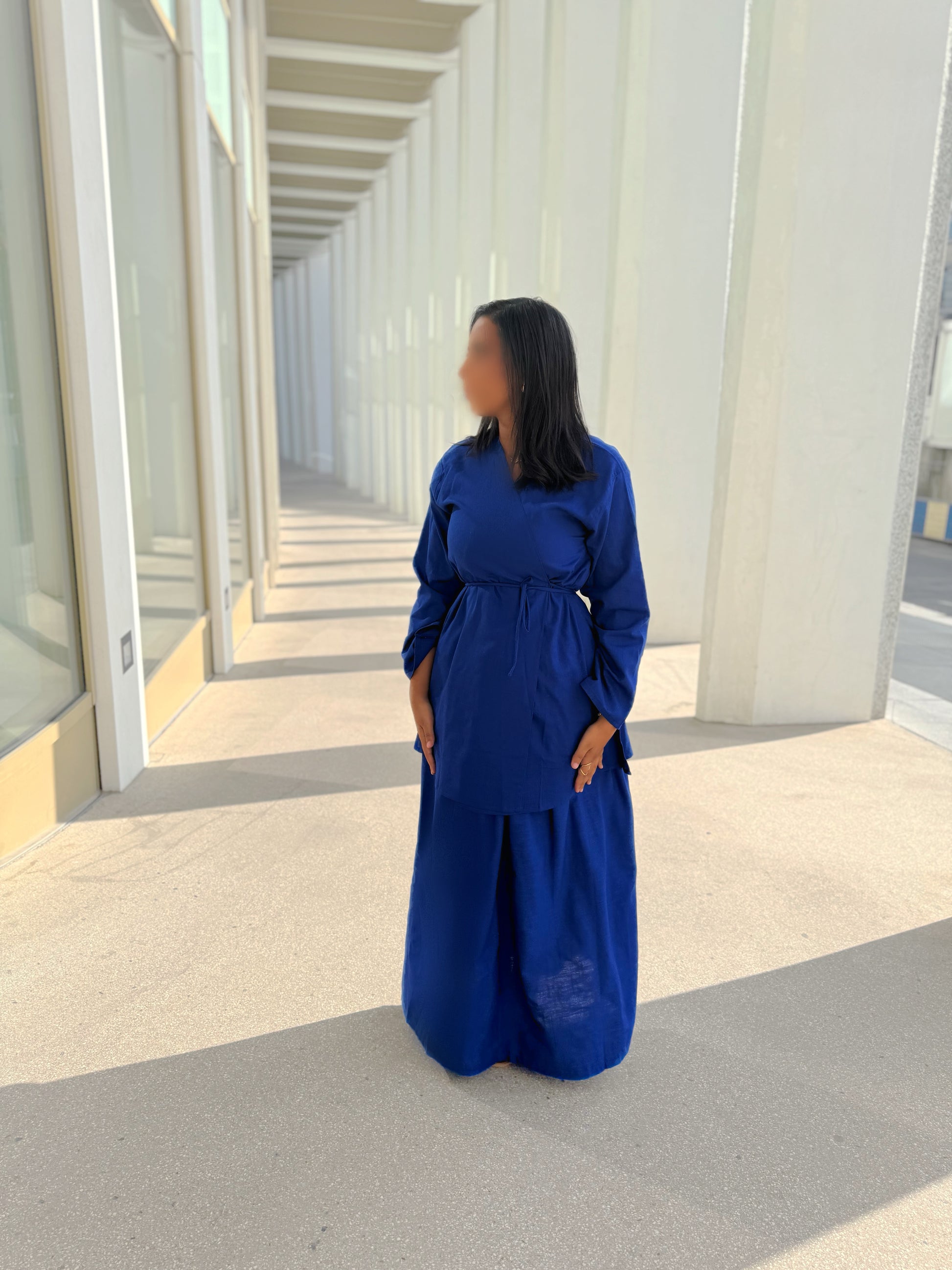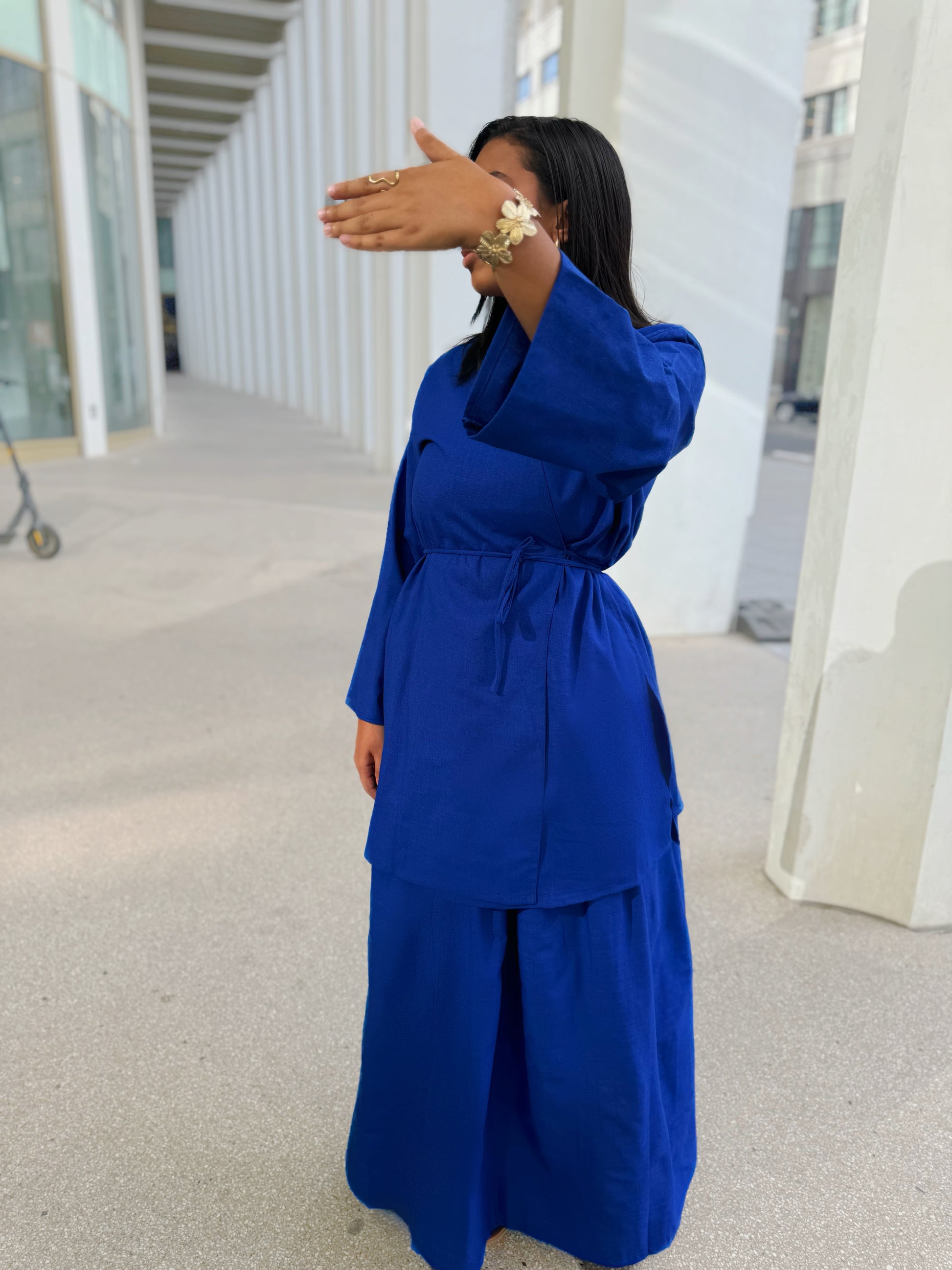 Cet ensemble s’inspire du vestiaire coréen moderne, où le minimalisme raffiné rencontre le confort des coupes amples et des matières naturelles. Le lin bleu roi apporte une touche vibrante et noble, tout en gardant une allure sobre et sophistiquée.