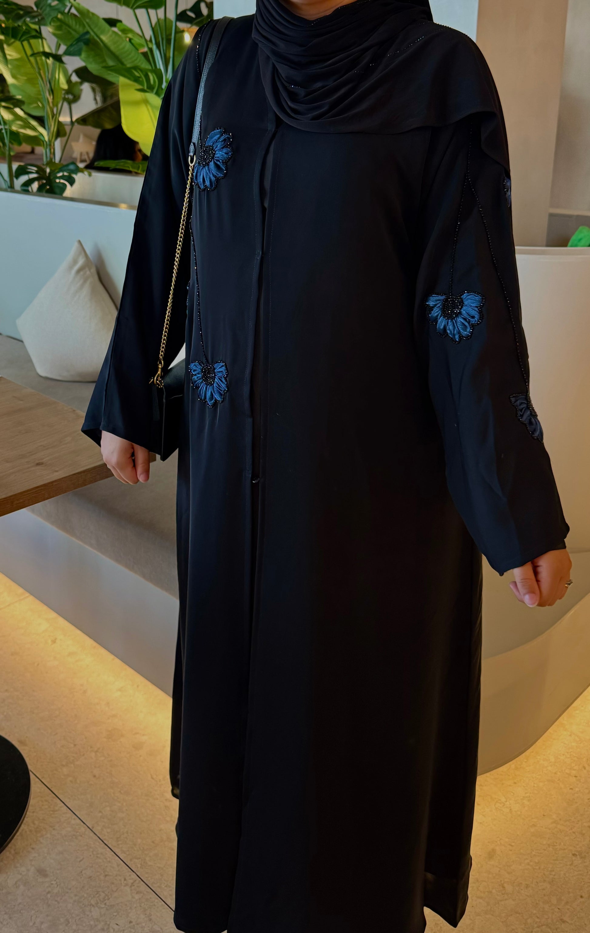 Élégante abaya noire conçue dans un Nida coréen haut de gamme, à la coupe fluide et minimaliste.