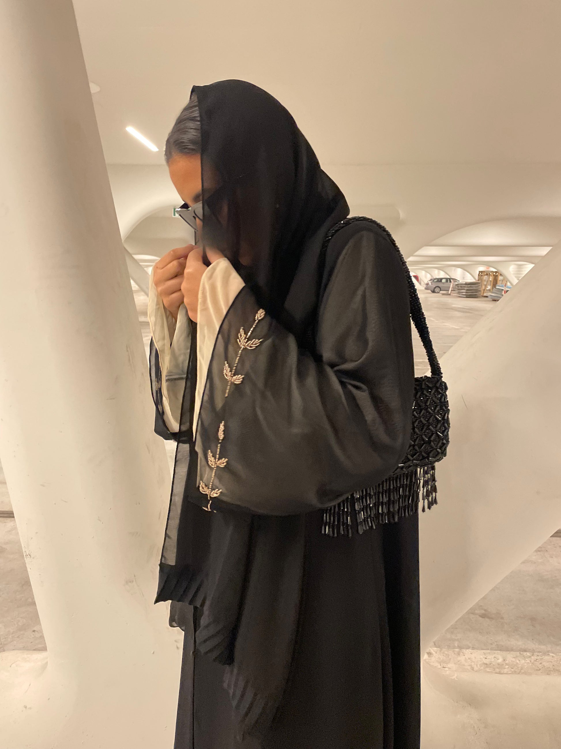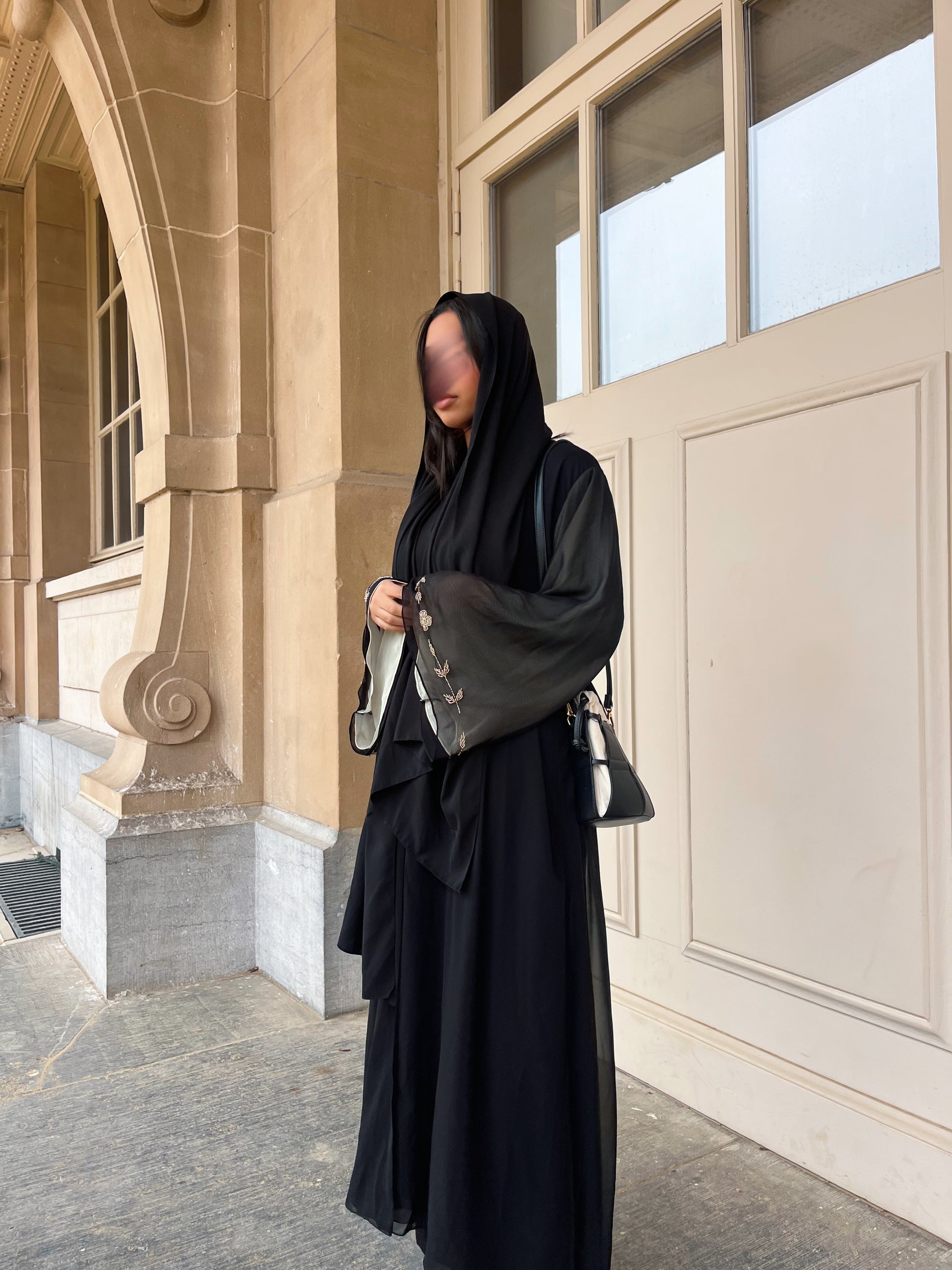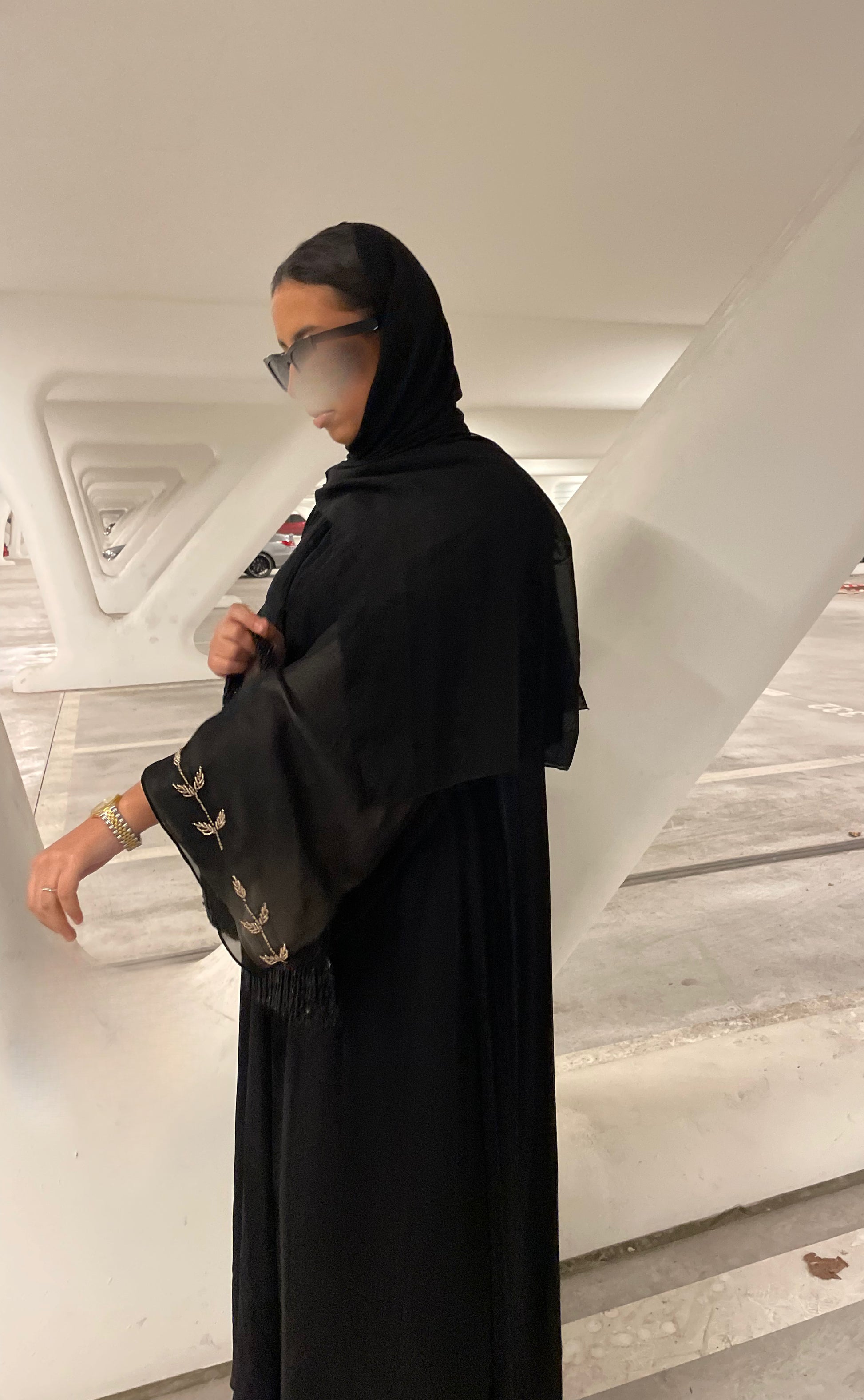 La particularité de cette abaya sont ses manches brodée de perle cousue à la main par nos couturiers qualifiés dans notre atelier aux Émirats .