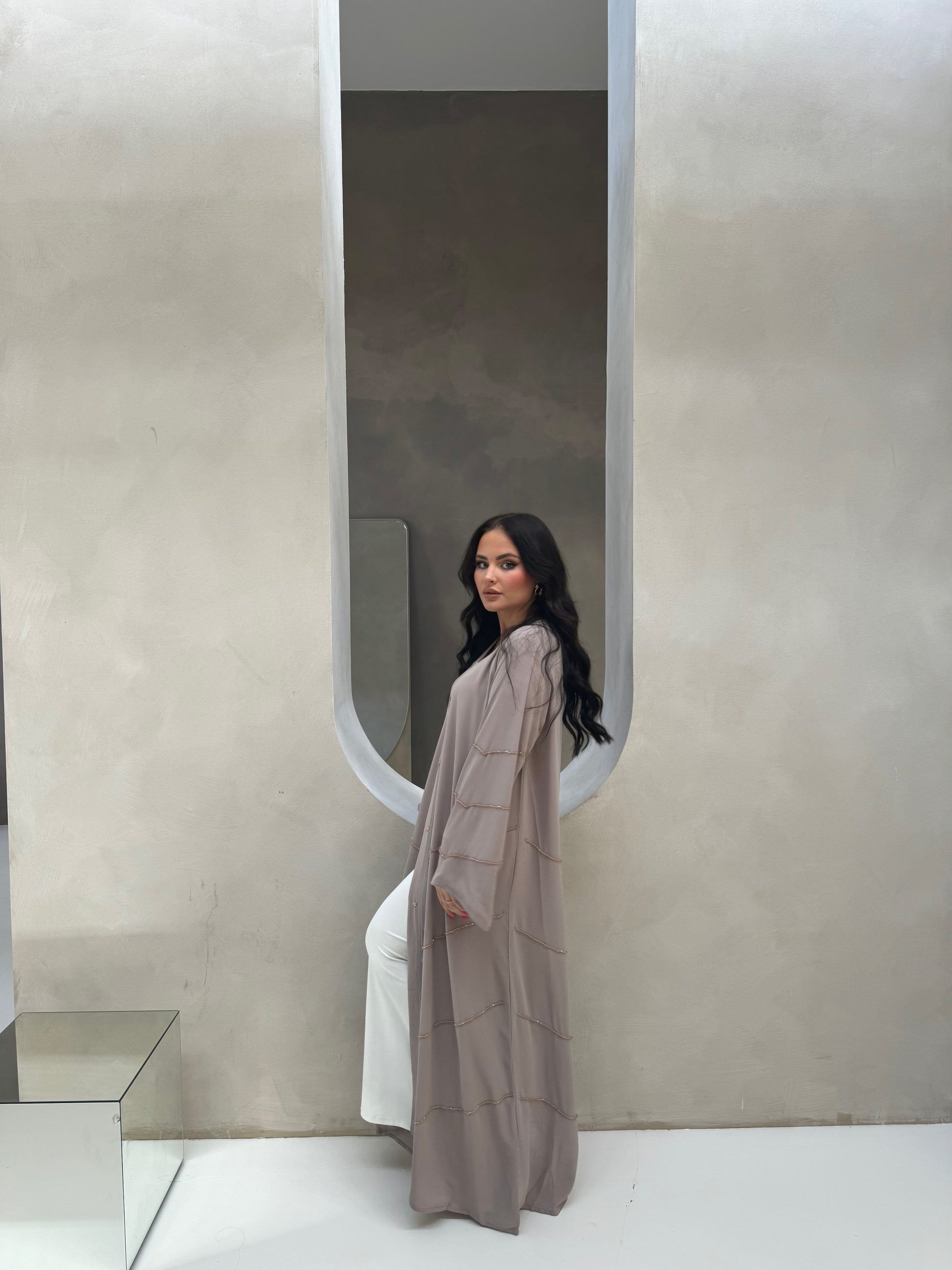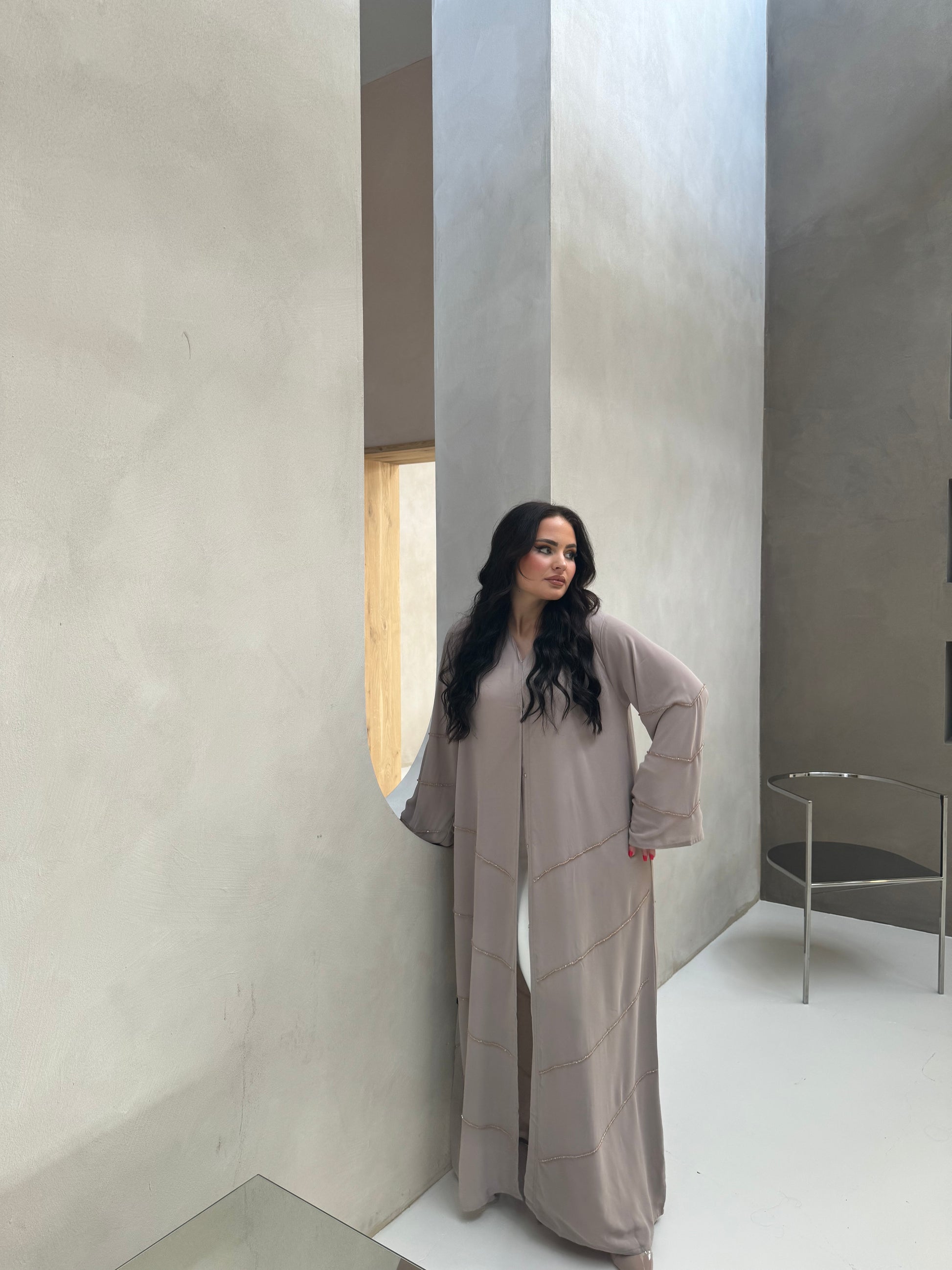 Sa coupe ample et élégante assure un confort optimal tout en sublimant votre silhouette. Parfaite pour les soirées chic, les événements festifs, ou toute occasion où vous souhaitez éblouir, cette abaya en mousseline perlée à la main et ornée de strass est l'incarnation même du raffinement et de l'élégance.