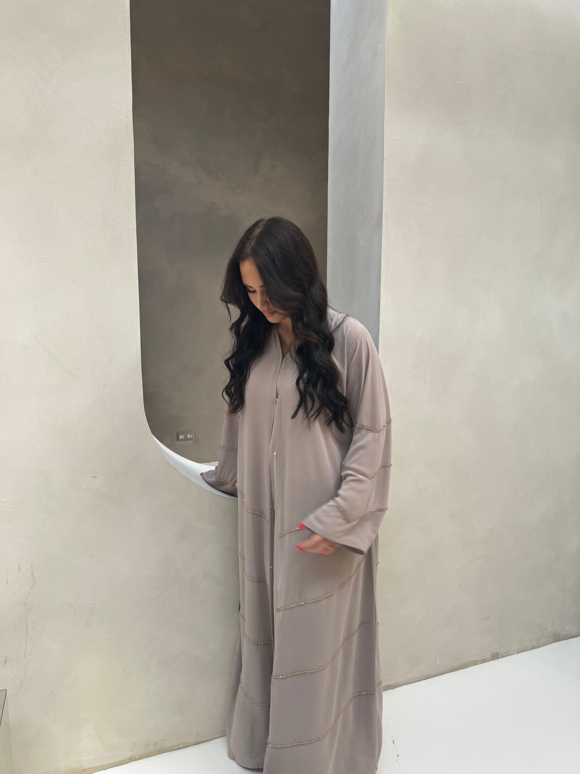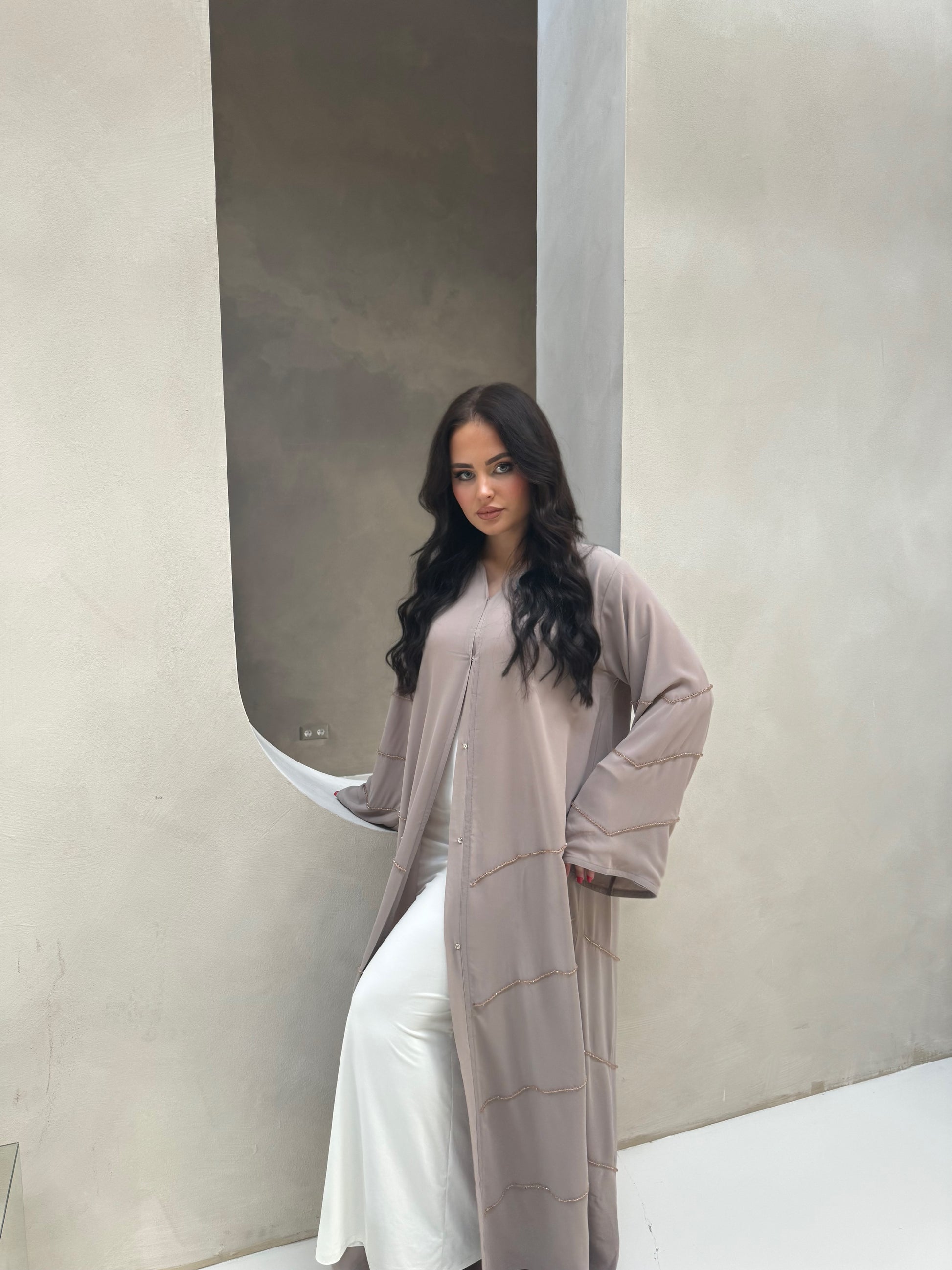 Les strass, minutieusement disposés tout autour de l'abaya, captent la lumière à chaque mouvement, créant un éclat raffiné et subtil. Mais ce qui rend cette abaya véritablement unique, ce sont les perles appliquées à la main par des artisans experts. Chaque perle est posée avec soin, apportant une touche de luxe artisanal à cette pièce déjà exceptionnelle.