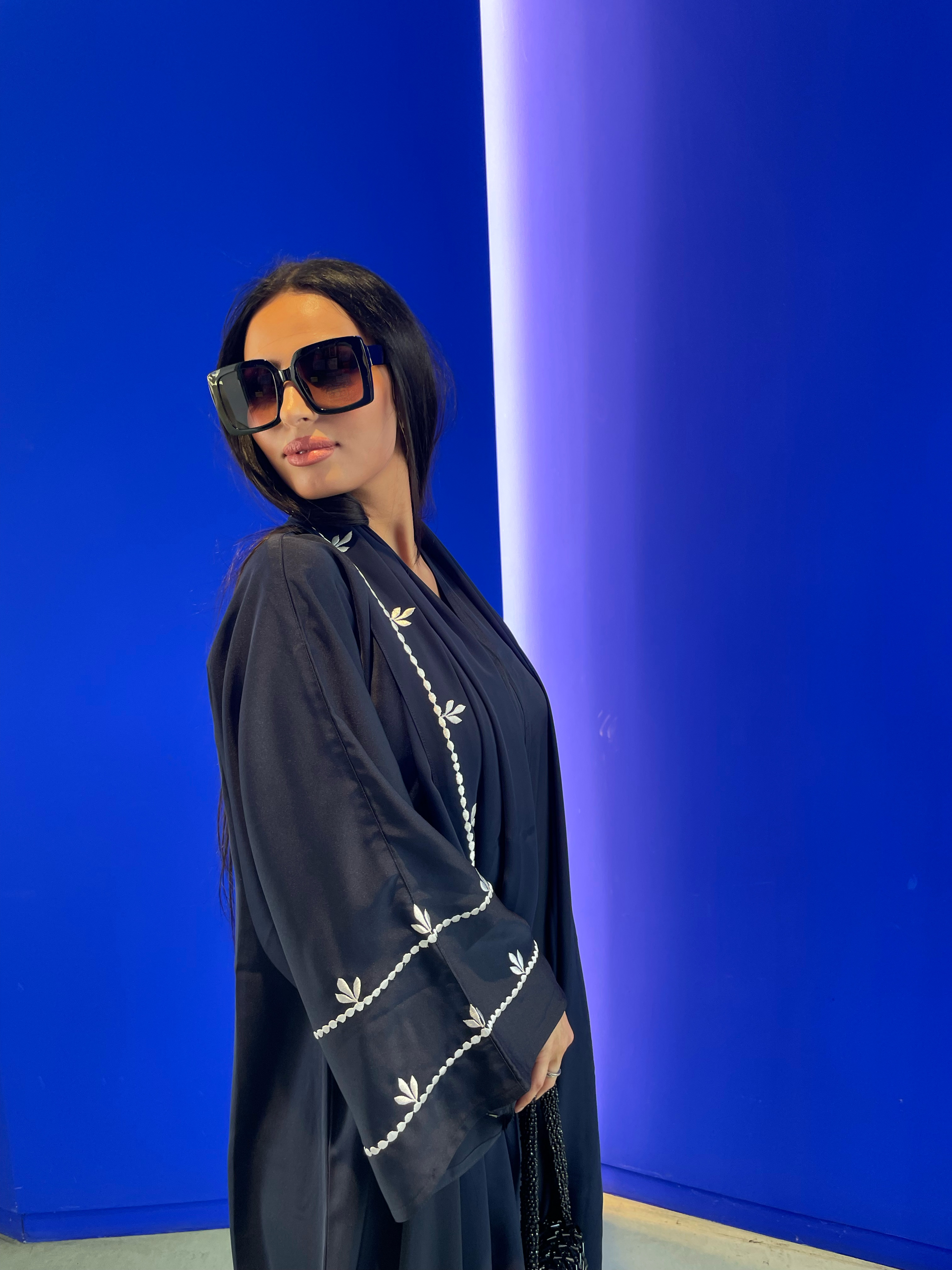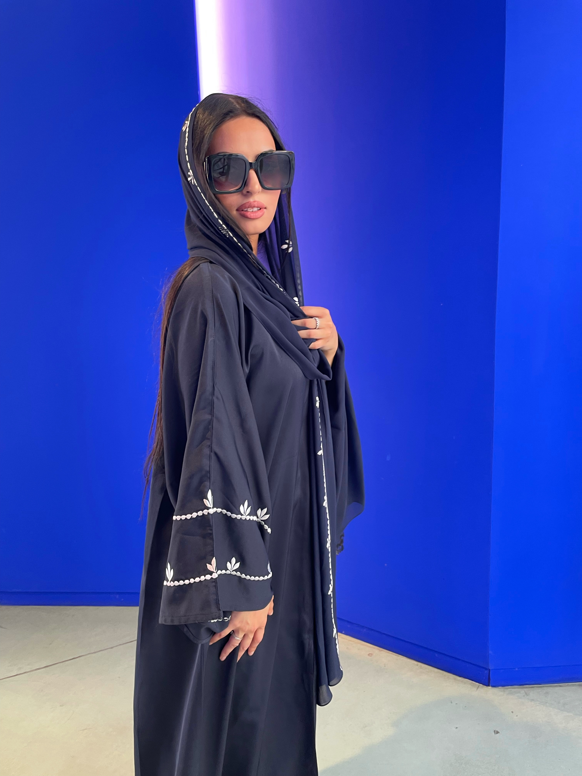 Brodée à la main au niveau des manches ainsi que sur son voile , des détails qui rendent cette magnifique pièce hors du commun . Vous pourrez porter le voile en tant que hijab ou en écharpe comme le font de nombreuse femme des pays du Golf