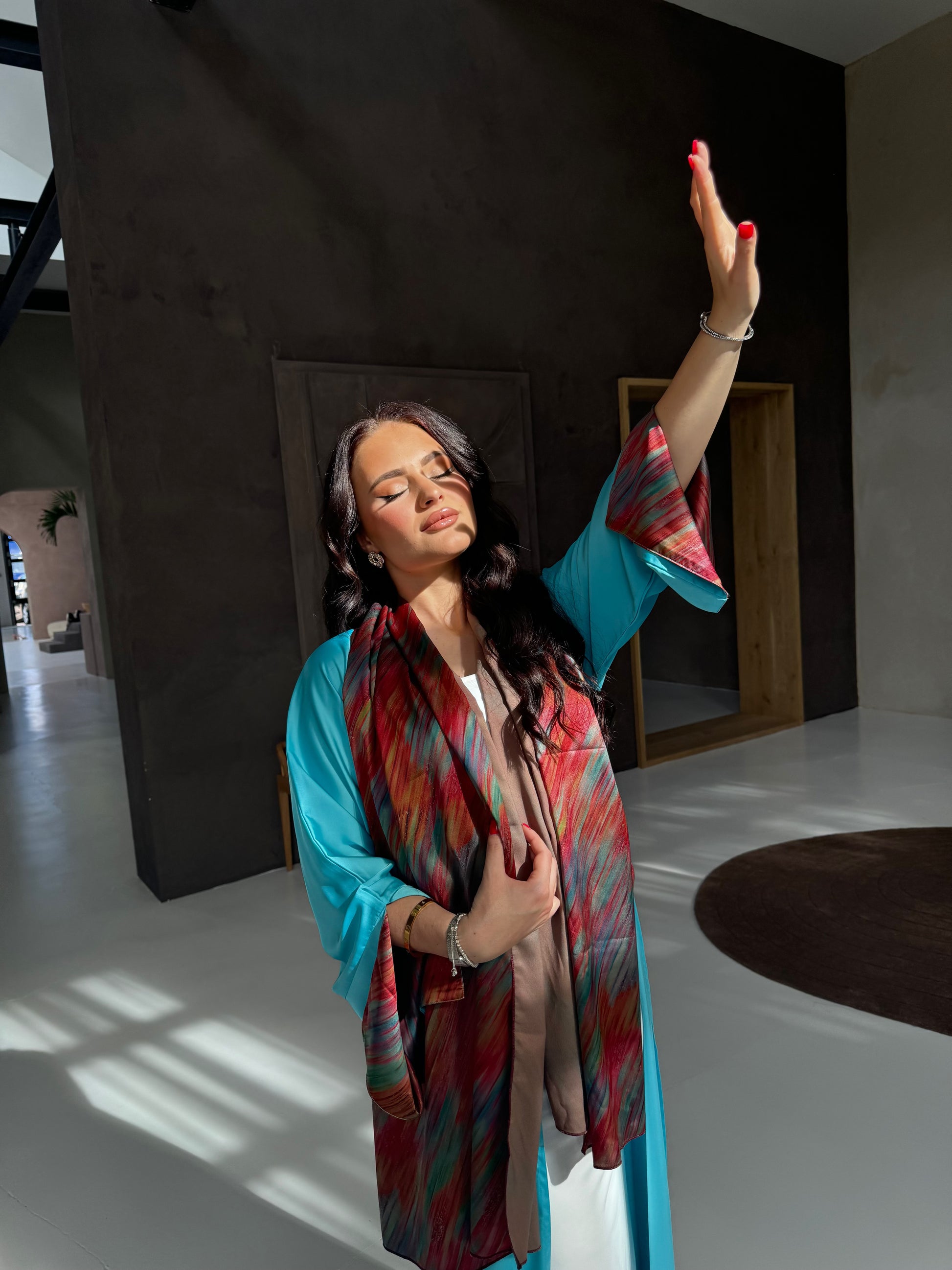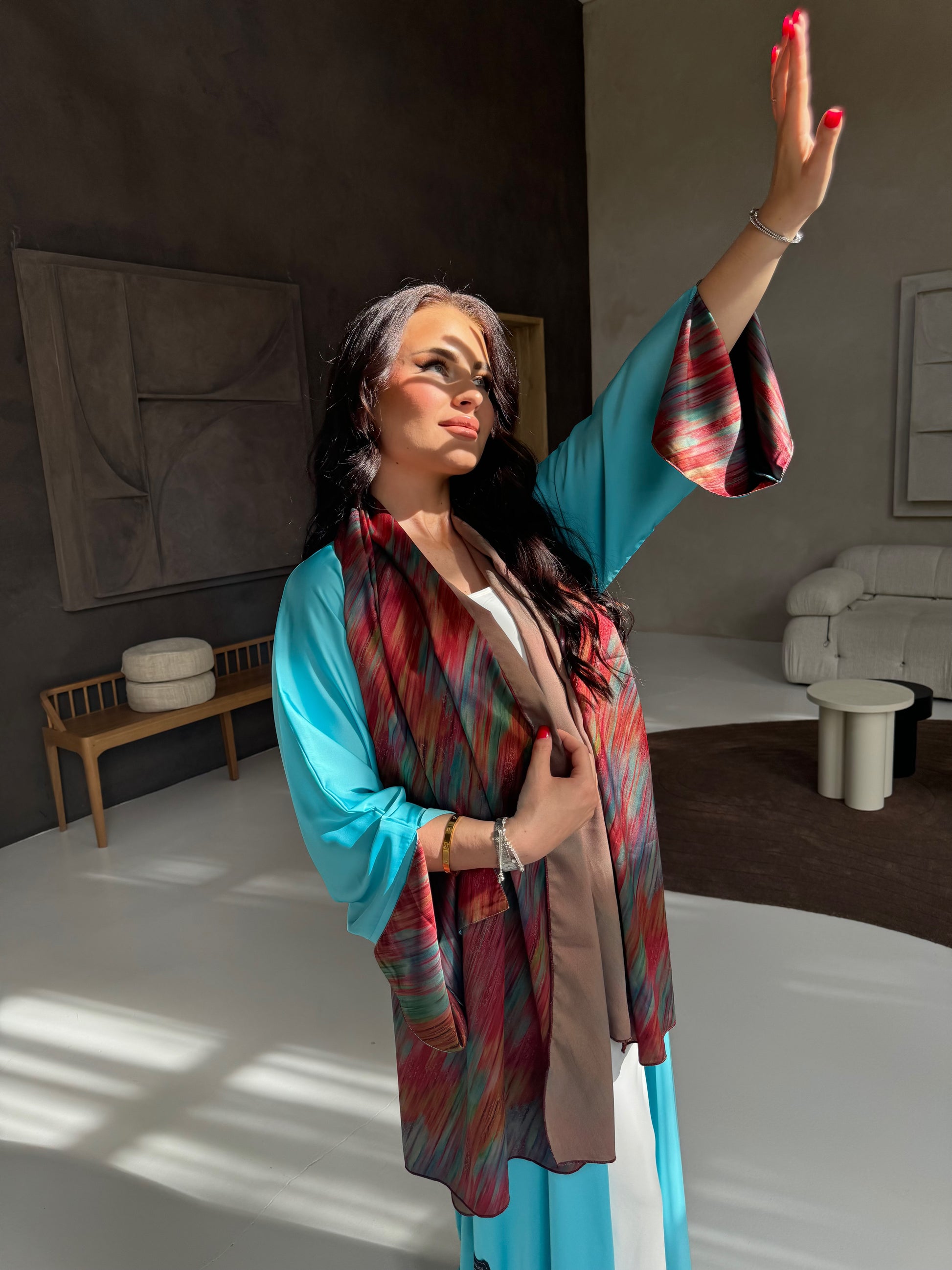 Ce qui rend cette abaya vraiment unique, ce sont les manches ouvertes, ornées d'un détail surprenant : un tissu coloré contrastant qui vient souligner votre style avec originalité. Ce contraste apporte une dimension artistique à la pièce, offrant un jeu subtil entre classicisme et modernité.